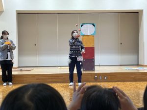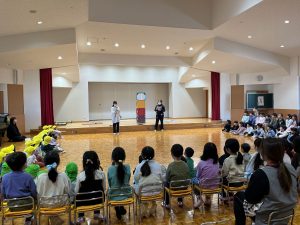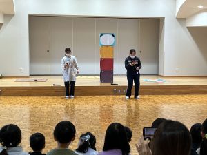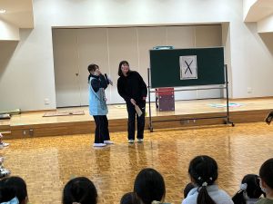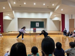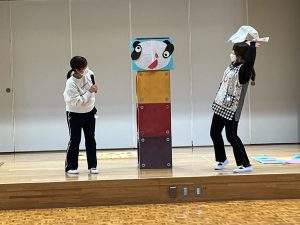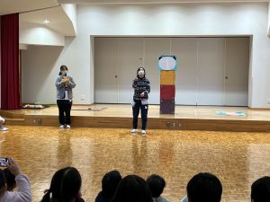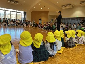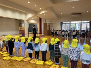 ホールに集まり、先生たちがお正月遊びを紹介し、みんなで遊びました。